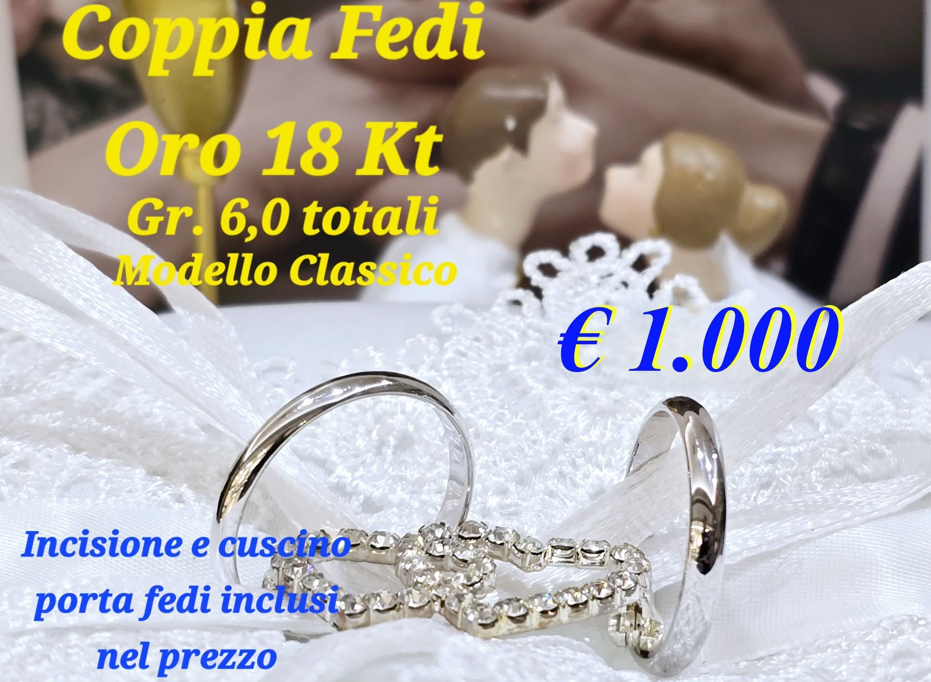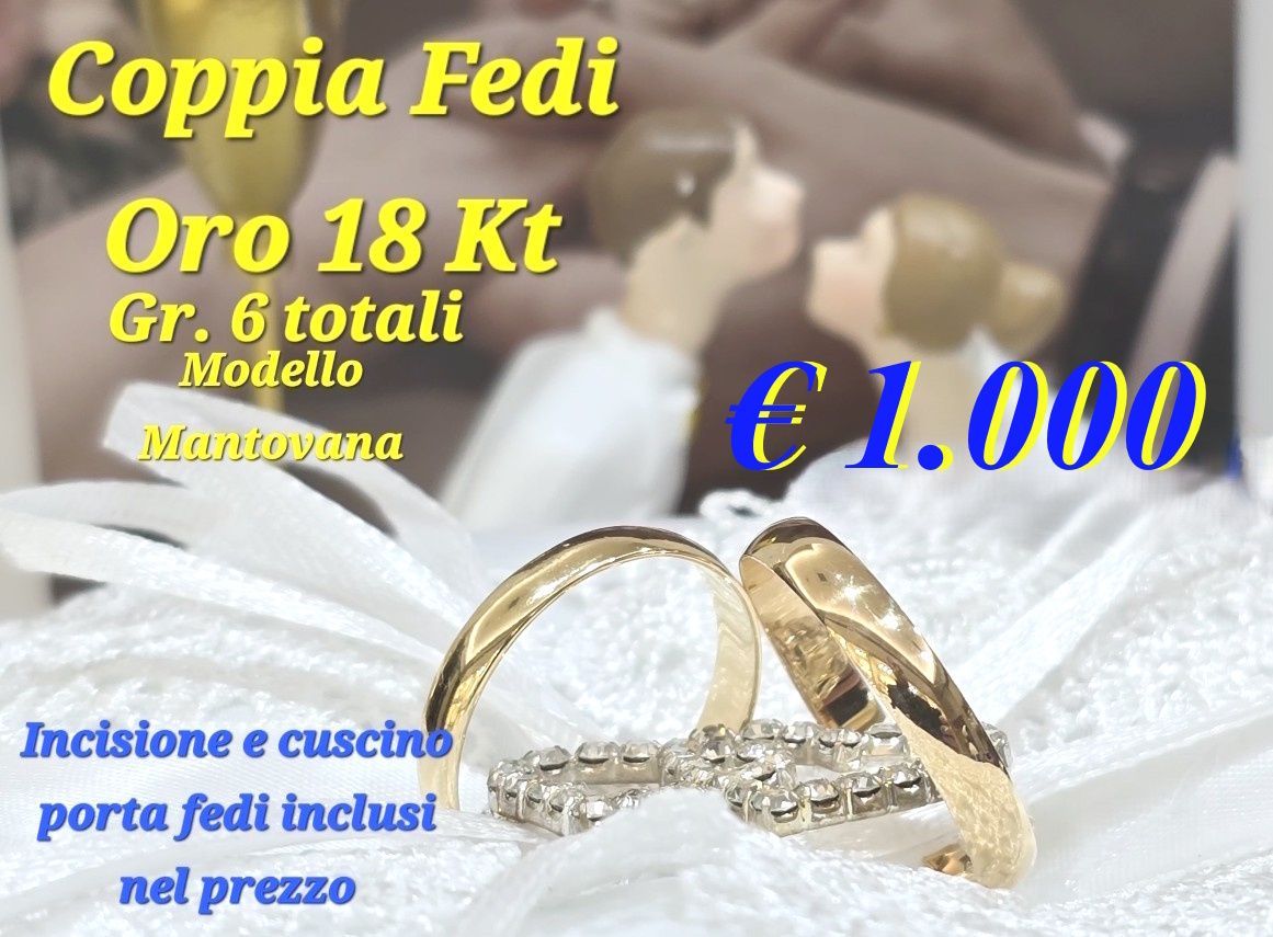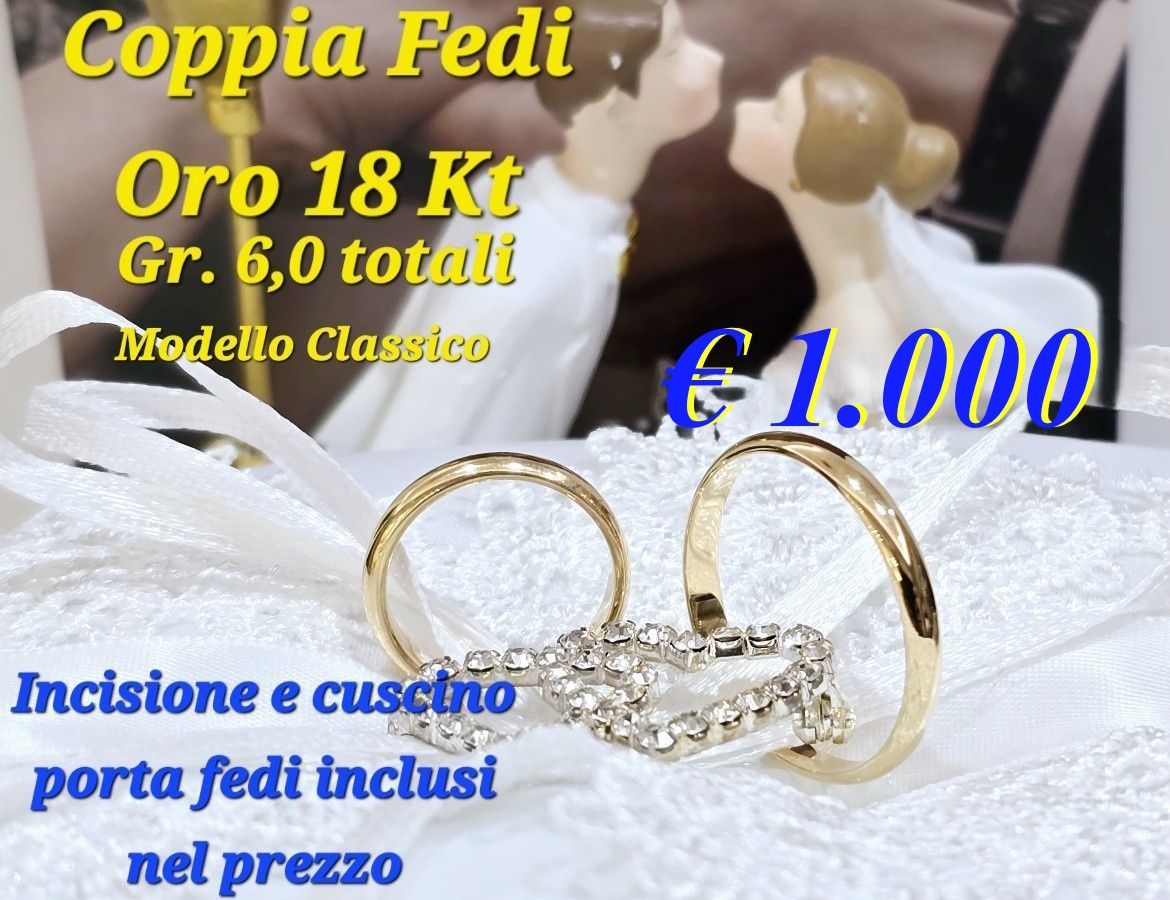 Offerte dedicate agli sposi Coppia Fedi in Oro 18 Kt. Grammi 6 totali € 1.000,00 Incisione e cuscino porta fedi incluso