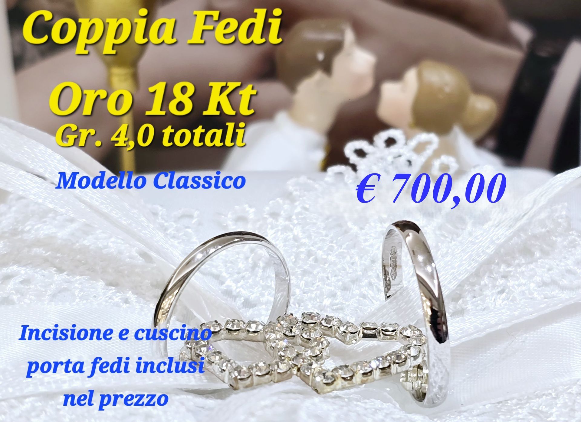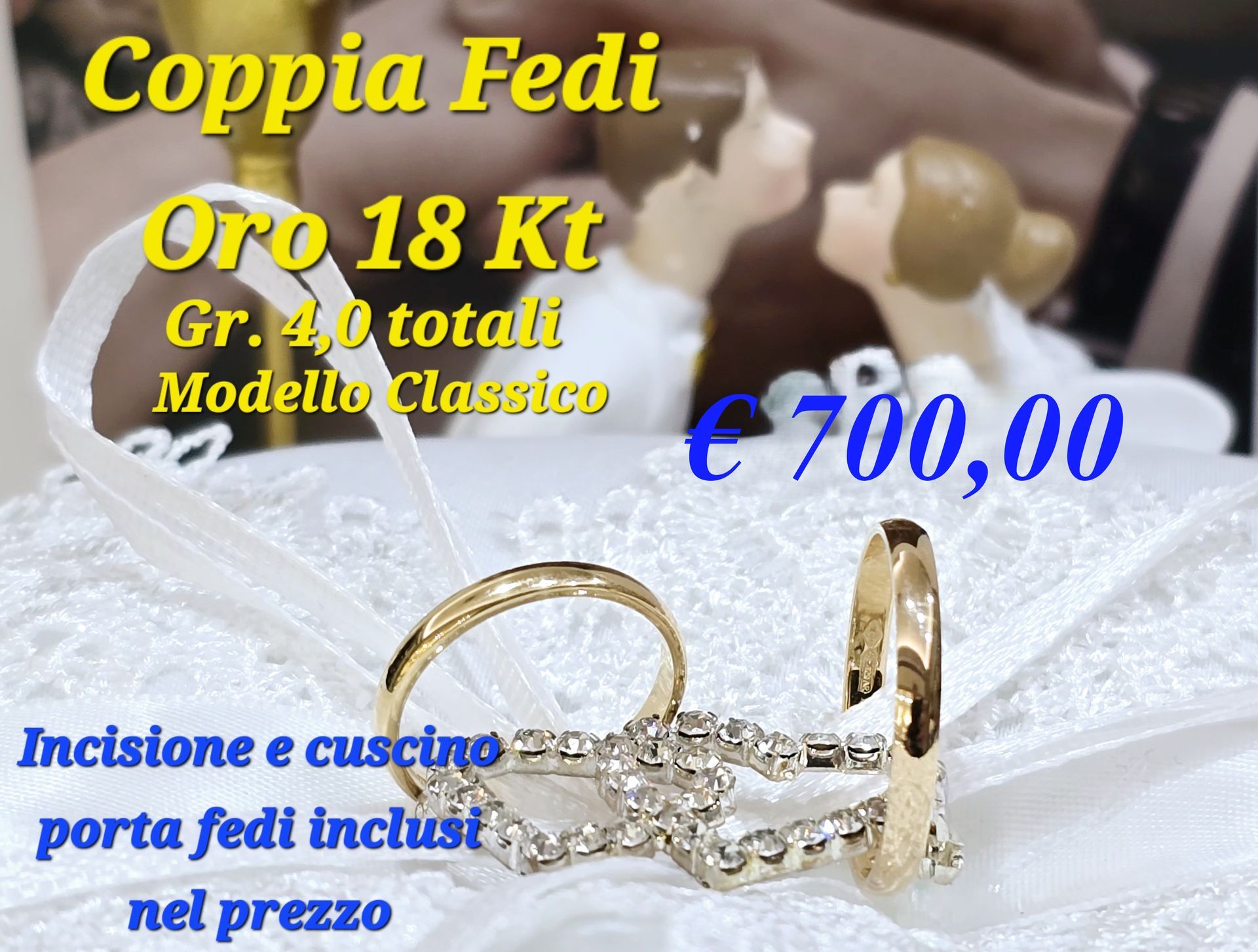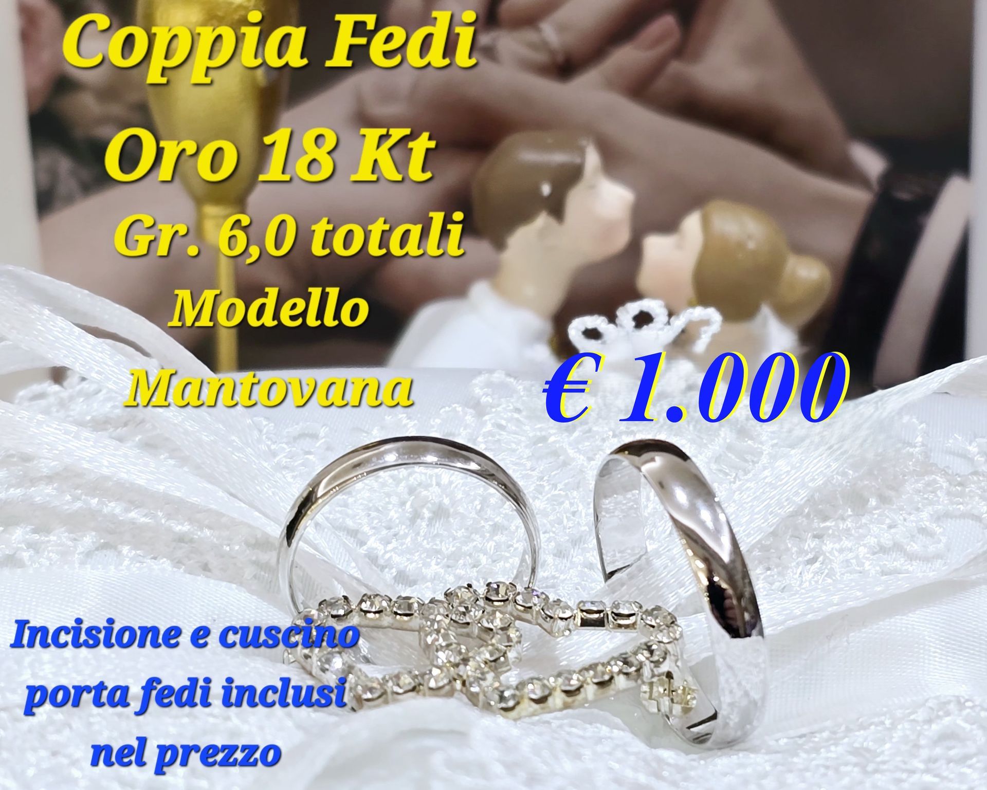 Offerte dedicate agli sposi Coppia Fedi in Oro 18 Kt. Grammi 6 totali € 1.000,00 Incisione e cuscino porta fedi incluso